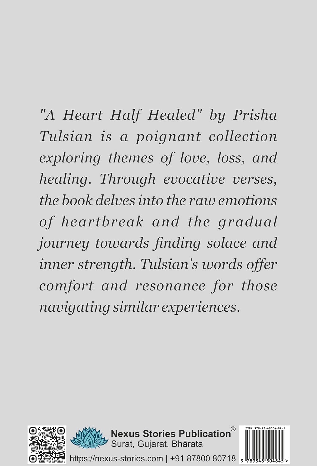“A Heart Half Healed” by Prisha Tulsian is a poignant collection exploring themes of love, loss, and healing. Through evocative verses, the book delves into the raw emotions of heartbreak and the gradual journey towards finding solace and inner strength. Tulsian’s words offer comfort and resonance for those navigating similar experiences.