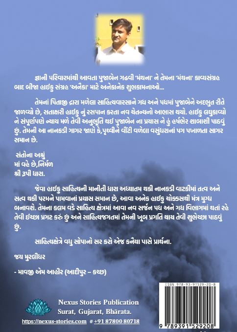 જ્ઞાની પરિવારમાંથી આવતા પુજાબેન ગઢવી ‘મંથના’ ને તેમના ‘મંથના’ કાવ્યસંગ્રહ બાદ બીજા હાઈકુ સંગ્રહ ‘અનૈકા’ માટે અનેકાનેક શુભકામનાઓ… તેમનાં પિતાજી દ્રારા મળેલા સાહિત્યવારસાને ગધ અને પધમાં પુજાબેને અદભુત રીતે જાળવ્યો છે, સતાક્ષરી હાઈકુ નું રસપાન કરતા નવ ચેતન્યનો આભાસ થયો. હાઈકુ લઘુકાવ્યો ને સંપૂર્ણપણે ન્યાય મળે તેવી અનુભૂતિ થઈ પુજાબેન ના પ્રયાસ ને હું હર્ષભેર શાબાશી પાઠવું છું. તેમની આ નાનકડી ગાગર જાણે કે,પૃથ્વીને વીંટી વળેલા વસુંધરાનાં પગ પખાળતા સાગર સમાન છે. સંતોના અશ્રું માં વહે છે,નિર્મળ શ્રી રૂપી ધારા. જેવા હાઈકુ સાહિત્યની માનીતી ધારા અધ્યાતમ થકી નાનકડી વાટકીમાં તત્વ અને સત્વ થકી પરમને પામવાનાં પ્રયાસ સમાન છે, આવા અનેક હાઈકુ ચોક્કસથી મંત્ર મુગ્ધ બનાવશે. તેમના કલમ વડે સાહિત્ય ક્ષેત્રમાં આવા નવ સર્જન પદ્ય અને ગદ્ય વિભાગમાં થતાં રહે તેવી ઈચ્છા પ્રગટ કરું છું અને સાહિત્યજગતમાં તેમની ખૂબ પ્રગતિ થાય તેવી શુભેચ્છા પાઠવું છું. સાહિત્યક્ષેત્રે વધુ સોપાનો સર કરો એજ કનૈયા પાસે પ્રાર્થના. જય મુરલીધર – માવજી એમ આહીર (આદીપુર – કચ્છ)