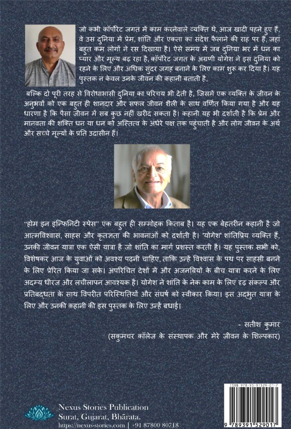 जो कभी कॉर्पोरेट जगत में काम करनेवाले प्रोफेसिओनल थे, आज खादी पहने हुए हैं, वे उस दुनिया में प्रेम, शांति और एकता का संदेश फैलाने की राह पर हैं, जहां बहुत कम लोगों ने रस दिखाया है। ऐसे समय में जब दुनिया भर में धन का प्यार और मूल्य बढ़ रहा है, कॉर्पोरेट जगत के अग्रणी योगेश ने इस दुनिया को रहने के लिए और अधिक सुंदर जगह बनाने के लिए काम शुरू कर दिया है। यह पुस्तक न केवल उनके जीवन की कहानी बताती है, बल्कि दो पूरी तरह से विरोधाभासी दुनिया का परिचय भी देती है, जिसमें एक व्यक्ति के जीवन के अनुभवों को एक बहुत ही शानदार और सफल जीवन शैली के साथ वर्णित किया गया है और यह धारणा है कि पैसा जीवन में सब कुछ नहीं खरीद सकता है। कहानी यह भी दर्शाती है कि प्रेम और मानवता की शक्ति धन या धन को अस्तित्व के अंधेरे पक्ष तक पहुंचाती है और लोग जीवन के अर्थ और सच्चे मूल्यों के प्रति उदासीन हैं। “होम इन इन्फिनिटी स्पेस” एक बहुत ही सम्मोहक किताब है। यह एक बेहतरीन कहानी है जो आत्मविश्वास, साहस और कृतज्ञता की भावनाओं को दर्शाती है। ‘योगेश’ शांतिप्रिय व्यक्ति हैं, उनकी जीवन यात्रा एक ऐसी यात्रा है जो शांति का मार्ग प्रशस्त करती है। यह पुस्तक सभी को, विशेषकर आज के युवाओं को अवश्य पढ़नी चाहिए, ताकि उन्हें विश्वास के पथ पर साहसी बनने के लिए प्रेरित किया जा सके। अपरिचित देशों में और अजनबियों के बीच यात्रा करने के लिए अदम्य धीरज और लचीलापन आवश्यक है। योगेश ने शांति के नेक काम के लिए दृढ़ संकल्प और प्रतिबद्धता के साथ विपरीत परिस्थितियों और संघर्ष को स्वीकार किया। इस अद्भुत यात्रा के लिए और उनकी कहानी की इस पुस्तक के लिए उन्हें बधाई। – सतीश कुमार (सकुमचर कॉलेज के संस्थापक और मेरे जीवन के शिल्पकार।)