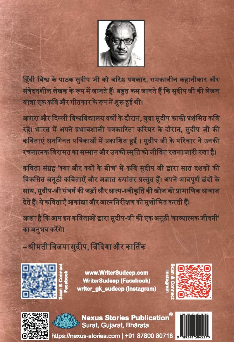 ‘क्या और क्यों के बीच’ कविता संग्रह में, १९५६ से २०१९ वर्षों के दौरान सुदीप जी द्वारा लिखित अनोखी और विशेष कविताएँ प्रस्तुत हैं। सन २०१९ तक इन कविताओं को सुदीप जी ने विकसित और ताज़ा रखना जारी रखा था। यह संग्रह उनके सबसे अद्यतन लिखित संस्करणों को प्रस्तुत करता है।