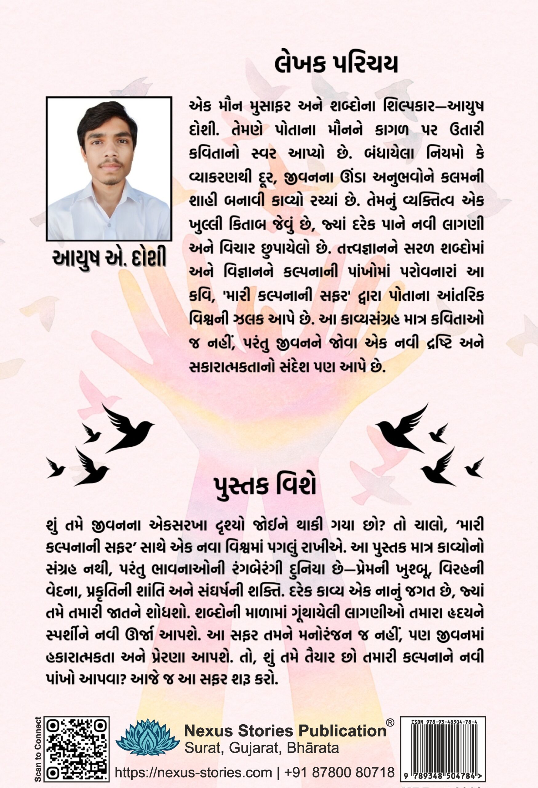 ‘મારી કલ્પનાની સફર’ કાવ્યસંગ્રહના આ શબ્દો મારા હૃદયના પડઘા છે, જે મારા મનના ઊંડાણમાંથી ઉદ્ભવ્યા છે. આ પુસ્તક માત્ર કાવ્યોનો સંગ્રહ નથી, પરંતુ મારા આત્માની એક અદભુત યાત્રા છે. ક્યારેક હું શબ્દોમાં ખોવાઈ ગયો, તો ક્યારેક શબ્દોએ મને શોધી કાઢ્યો. આ કાવ્યોમાં મેં પ્રેમ, વિરહ, પ્રકૃતિ, સંઘર્ષ અને માનવ સંબંધોની વાત કરી છે. ક્યારેક ઊંડા મૌનની ભાષાને સમજવાનો પ્રયત્ન કર્યો છે, તો ક્યારેક ચેતનાના સ્ત્રોતને પામવાની કોશિશ કરી છે. આ સફરનો મુખ્ય હેતુ એ છે કે દરેક વાચકને પોતાના જીવનની મુશ્કેલ ક્ષણોમાં એક સાચા મિત્રની જેમ સાંત્વના મળે, જે તેમને હિંમત અને પ્રેરણા આપે. હું આ પુસ્તક મારા ગુરુજનો અને માતા-પિતાને સમર્પિત કરું છું, જેમણે મને આ સફરમાં હંમેશા માર્ગદર્શન આપ્યું છે. મને આશા છે કે આ સફર તમને પણ તમારી કલ્પનાની દુનિયામાં લઈ જશે અને તમારા જીવનને એક નવો દ્રષ્ટિકોણ આપશે. આ સફરનો આરંભ કરનાર દરેક વાચકને મારા હૃદયપૂર્વકના ધન્યવાદ.
