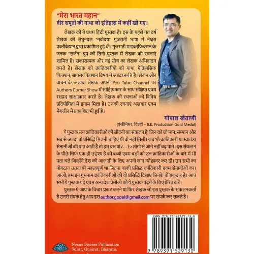 गोपाल खेताणी (इंजीनियर, दिल्ही – B.E. Production Gold Medal) “मेरा भारत महान” – वीर सपूतों की गाथा जो इतिहास में कहीं खो गए। लेखक की ये प्रथम हिंदी पुस्तक है। इस के पहले गत वर्ष लेखक की लघुनवल “नवोदय” गुजराती भाषा में नेक्षस पब्लीकेशन द्वारा प्रकाशित हुई थी। गुजराती माइक्रोफिक्शन के जनक “सर्जन” ग्रुप की तिनो पुस्तक में लेखक की रचनाएं शामिल है। सकारात्मक और नई सोच का लेखक अभिवादन करते है। लेखक को क्रांतिकारीयों की गाथा, ऐतिहासिक फिक्शन, सायन्स फिक्शन विषय में ज्यादा रूचि है। लेखन और वाचन के अलावा लेखक अपनी You Tube Channel पर Authors Corner Show में साहित्यकार के साथ संक्षिप्त एवम रसप्रद साक्षात्कार करते है। लेखक की रचनाओं को विविध प्रतियोगिता में इनाम मिला है। उनकी रचनाएं अखबार एवम मैगजीन में प्रकाशित भी हुई है। “मेरा भारत महान” – वीर सपूतों की गाथा जो इतिहास में कहीं खो गए। ये पुस्तक उन क्रांतिकारीओं की जीवनी का संकलन है, जिन को जो मान, सम्मान और सब से ज्यादा तो प्रसिद्धि मिलनी चाहिए थी वो नहीं मिली। जब भी क्रांतिकारी या स्वातंत्र्य सेनानीओं की बात आती है तो हम बस वो ८ – १० लोगो से आगे नहीं बढ़ पाते। इस संकलन के पीछे सिर्फ एक ही उद्देश्य है की बच्चों एवम बडों को उन क्रांतिकारीओं के बारे में भी पता चले जिन्होंने देश की आजादी के लिए अपनी जान न्योछावर कर दी। उन सभी का योगदान उतना ही महत्वपूर्ण था जितना बाकी प्रसिद्ध क्रांतिकारी एवम सेनानीओं का। आओ; हम इन गुमनाम क्रांतिकारीओं को वो प्रसिद्धि दिलाए जिनके वो हकदार है। आप सभी ये पुस्तक पढ़े एवम अन्य देश प्रेमीओ को ये पुस्तक पढ़ने के लिए प्रेरित करें। पुस्तक पे आप के विचार प्रकट करने या फिर लेखक जो इस पुस्तक के संकलनकर्ता है उनसे संपर्क हेतु आप इस [email protected] पर संपर्क कर सकते है।