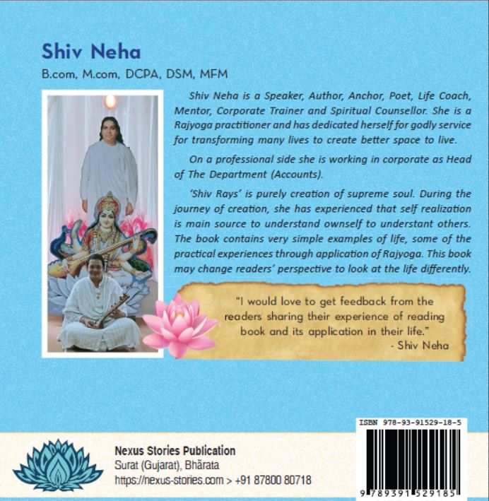 Shiv Neha (B.com, M.com, DCPA, DSM, MFM) Shiv Neha is a Speaker, Author, Anchor, Poet, Life Coach, Mentor, Corporate Trainer, and Spiritual Counsellor. She is a Rajyoga practitioner and has dedicated herself to godly service for transforming many lives to create a better space to live. On a professional side, she is working in corporate as Head of The Department (Accounts). ‘Shiv Rays’ is purely a creation of the supreme soul. During the journey of creation, she has experienced that self-realization is the main source to understand her own self to understand others. The book contains very simple examples of life, some of the practical experiences through the application of Rajyoga. This book may change readers’ perspectives to look at life differently. “I would love to get feedback from the book and its application in their life.” – Shiv Neha readers sharing their experience of reading