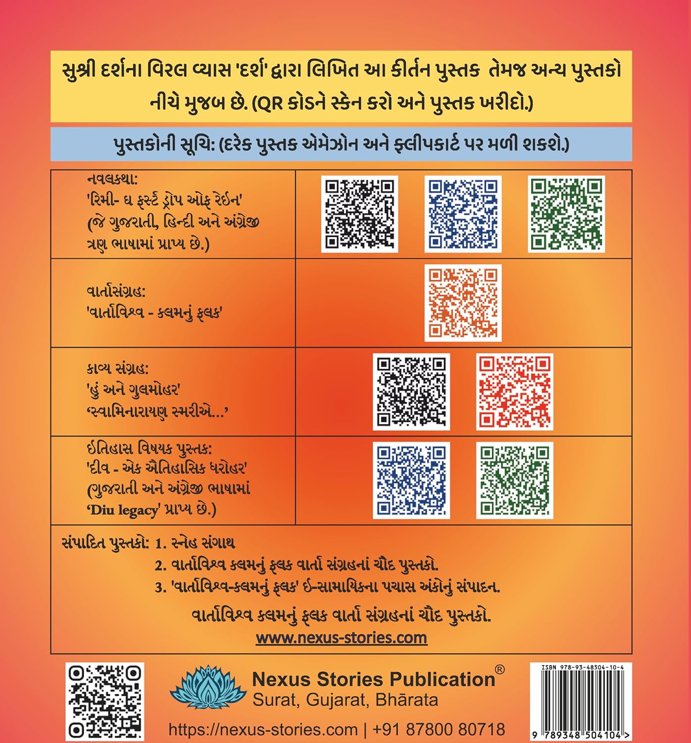 શ્રી સ્વામિનારાયણ નામનો મહિમા જીવનમાં પૂજ્ય બા થી મળ્યો જે પરિવારમાં પૂજ્ય કાકા, ફૈબા, પપ્પા-મમ્મી અને સદ્દગત બેનની શ્રદ્ધા અને ભક્તિ સાથે દ્રઢ થઇ મારામાં આસ્થાનું બળ બની રહ્યું. જીવનની પ્રત્યેક ક્ષણોમાં હરિકૃષ્ણ મહારાજ સાથે જ છે એ વિશ્વાસ કાયમ મનમાં રહ્યો. મહારાજના મંદિરો, પ્રસાદીનાં સ્થાનકો,શિક્ષાપત્રી,વચનામૃત, મહારાજની ચેસ્ટાઓ,કીર્તનો,પારાયણો બધું જ નાનપણથી આકર્ષતું રહ્યું હતું,પરંતુ ખરી સમજણ મહારાજનો મહિમા પૂજ્ય ગુરુજી જ્ઞાનજીવનદાસજી સ્વામી ( કુંડલધામ ) ની કથાઓથી વિકસીત થતું અનુભવ્યું. મમ્મીને ગુમાવ્યા અને એ જ સમયે ગુરુજીની ઓનલાઈન કથા અને સત્સંગ બંનેની નજીક આવી જેણે અમૃતલેપનું કાર્ય કર્યું. નવલકથા, ઇતિહાસ વિષયક પુસ્તક,વાર્તાસંગ્રહ, કાવ્ય સંગ્રહ વગેરે સાહિત્યના અનેક ક્ષેત્રોમાં ખેડાણ કર્યું હતું પરંતુ કીર્તન લખવાનું ક્યારેય વિચારેલું જ નહીં. રવિસભામાં ‘આવો નજીક થઈએ’અંતર્ગત પૂજય ગુરુજી જ્ઞાનજીવનદાસજી સ્વામીએ રવિસભા માં મારા ‘વાર્તાવિશ્વની’ વાર્તાનું દ્રષ્ટાંત આપ્યું અને કુંડળ ધામથી ઘનશ્યામ મહારાજ અમારા ઘરે લાવ્યા અને એ મહારાજ રાત્રે દસ વાગે ઘરે લાવ્યા અને એ સમયે અનાયાસે પ્રથમ કીર્તન લખાયું. મમ્મીના અક્ષરવાસ પછી કલમ,જીવન સુકાઈ ગયું લાગતું હતું ત્યારે આખું વર્ષ બીજું કંઈ જ નહીં માત્ર કીર્તનો જ લખાયા. પૂજ્ય ગુરુજીની કથા મનને સતત શાંતિ આપતી રહી અને કીર્તનો લખવા પ્રેરણા આપતી રહી. હું ક્યારેય કીર્તનો લખીશ તેવો લેશમાત્ર વિચાર સુદ્ધા નહોતો આવ્યો પરંતુ કુંડળધામથી આવેલ ઘનશ્યામ મહારાજની મૂર્તિને જોઉં અને બસ લખાય જાય… આ કીર્તનો લખવામાં હું તો નિમિત્ત માત્ર છું ખરેખર તો શ્રી સ્વામિનારાયણ ભગવાનની કૃપા અને પૂ. ગુરુજીના આશીર્વાદ જ પ્રેરણાના સ્ત્રોત્ર છે. ભરૂચ સત્સંગ મંડળની આભારી છું જેમણે મને નિત્ય કથા તરફ દોરી. સૌને ભાવથી જયશ્રી સ્વામિનારાયણ. –દર્શના વિરલ વ્યાસ.’દર્શ’