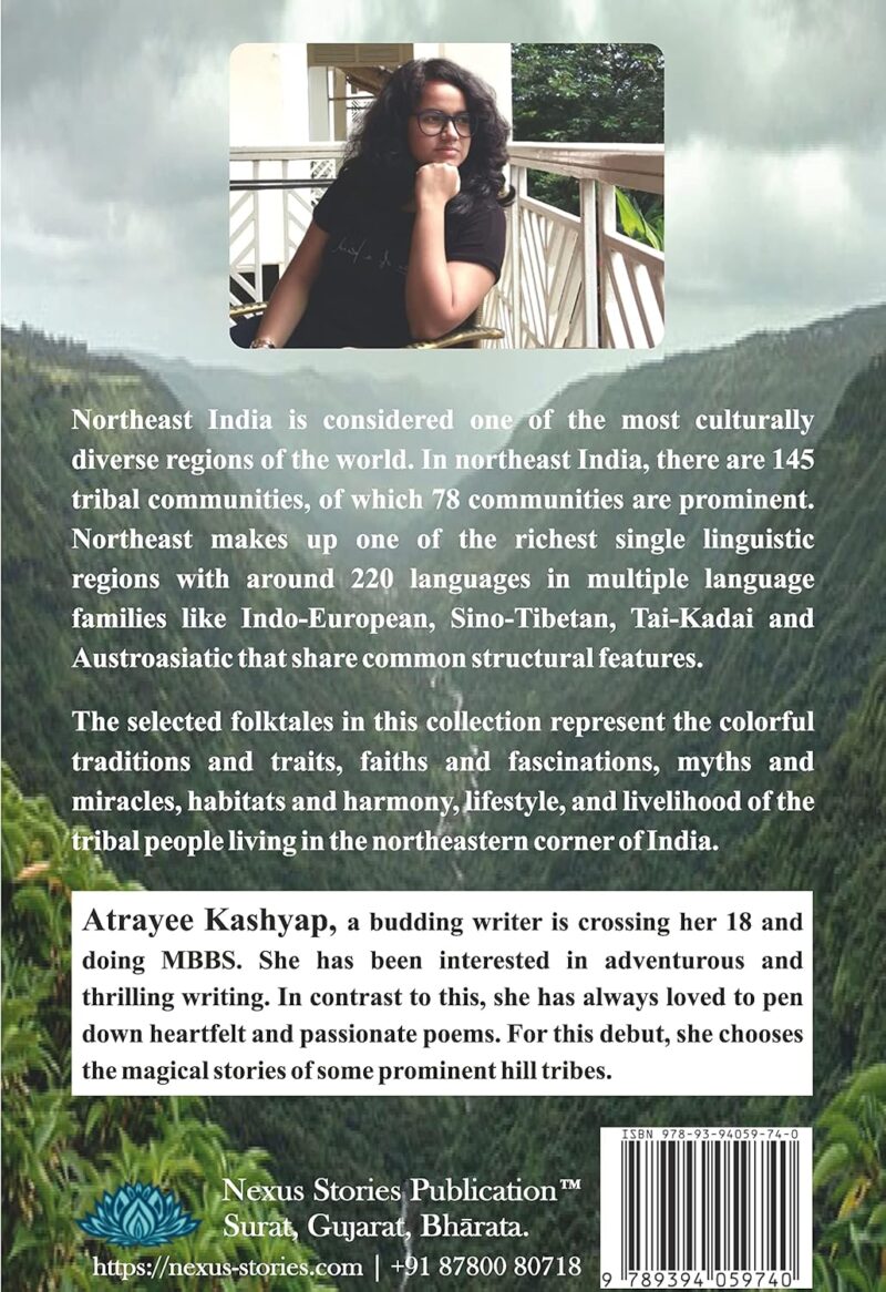 Northeast India is considered one of the most culturally diverse regions of the world. In northeast India, there are 145 tribal communities, of which 78 communities are prominent. Northeast makes up one of the richest single linguistic regions with around 220 languages in multiple language families like Indo-European, Sino-Tibetan, Tai-Kadai and Austroasiatic that share common structural features. The selected folktales in this collection represent the colorful traditions and traits, faiths and fascinations, myths and miracles, habitats and harmony, lifestyle, and livelihood of the tribal people living in the northeastern corner of India. Atrayee Kashyap, a budding writer is crossing her 18 and doing MBBS. She has been interested in adventurous and thrilling writing. In contrast to this, she has always loved to pen down heartfelt and passionate poems. For this debut, she chooses the magical stories of some prominent hill tribes.