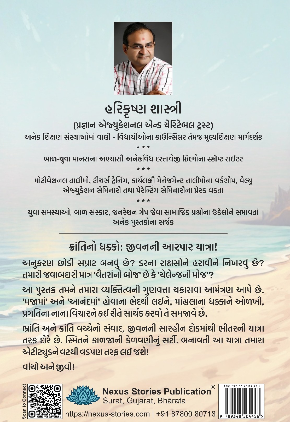 ક્રાંતિનો ધક્કો: જીવનની આરપાર યાત્રા! અનુકરણ છોડી સમ્રાટ બનવું છે? ડરના રાક્ષસોને હરાવીને નિખરવું છે? તમારી જવાબદારી માત્ર ‘વૈતરાંનો બોજ’ છે કે ‘ચેલેન્જની મોજ’? આ પુસ્તક તમને તમારા વ્યક્તિત્વની ગુણવત્તા ચકાસવા આમંત્રણ આપે છે. ‘મજામાં’ અને ‘આનંદમાં’ હોવાના ભેદથી લઈને, માંહ્યલાના ધક્કાને ઓળખી, પ્રગતિના નાના વિચારને કઈ રીતે સાર્થક કરવો તે સમજાવે છે. ભ્રાંતિ અને ક્રાંતિ વચ્ચેનો સંવાદ, જીવનની સારહીન દોડમાંથી ભીતરની યાત્રા તરફ દોરે છે. સ્મિતને કાળજાની કેળવણીનું સર્ટી. બનાવતી આ યાત્રા તમારા એટીટ્યુડને વટથી વડપણ તરફ લઈ જશે! વાંચો અને જીવો!