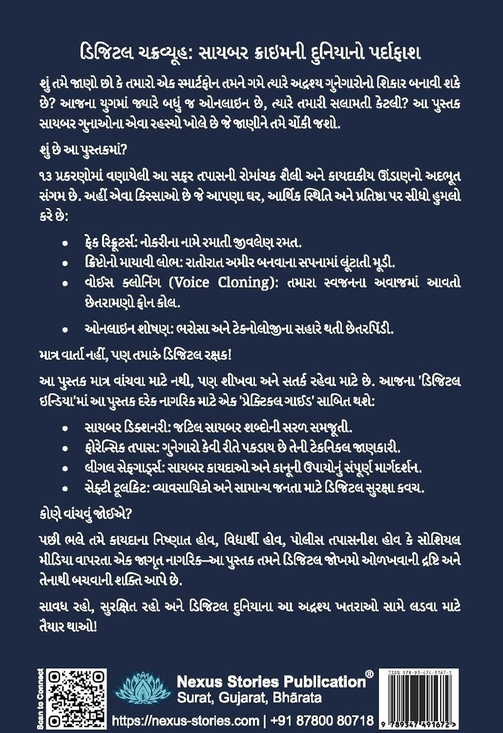 ડિજિટલ ચક્રવ્યૂહ: સાયબર ક્રાઇમની દુનિયાનો પર્દાફાશ શું તમે જાણો છો કે તમારો એક સ્માર્ટફોન તમને ગમે ત્યારે અદ્રશ્ય ગુનેગારોનો શિકાર બનાવી શકે છે? આજના યુગમાં જ્યારે બધું જ ઓનલાઇન છે, ત્યારે તમારી સલામતી કેટલી? આ પુસ્તક સાયબર ગુનાઓના એવા રહસ્યો ખોલે છે જે જાણીને તમે ચોંકી જશો. શું છે આ પુસ્તકમાં? ૧૩ પ્રકરણોમાં વણાયેલી આ સફર તપાસની રોમાંચક શૈલી અને કાયદાકીય ઊંડાણનો અદભૂત સંગમ છે. અહીં એવા કિસ્સાઓ છે જે આપણા ઘર, આર્થિક સ્થિતિ અને પ્રતિષ્ઠા પર સીધો હુમલો કરે છે: ફેક રિક્રૂટર્સ: નોકરીના નામે રમાતી જીવલેણ રમત. ક્રિપ્ટોનો માયાવી લોભ: રાતોરાત અમીર બનવાના સપનામાં લૂંટાતી મૂડી. વોઈસ ક્લોનિંગ (Voice Cloning): તમારા સ્વજનના અવાજમાં આવતો છેતરામણો ફોન કોલ. ઓનલાઇન શોષણ: ભરોસા અને ટેકનોલોજીના સહારે થતી છેતરપિંડી. માત્ર વાર્તા નહીં, પણ તમારું ડિજિટલ રક્ષક! આ પુસ્તક માત્ર વાંચવા માટે નથી, પણ શીખવા અને સતર્ક રહેવા માટે છે. આજના ‘ડિજિટલ ઇન્ડિયા’માં આ પુસ્તક દરેક નાગરિક માટે એક ‘પ્રેક્ટિકલ ગાઈડ’ સાબિત થશે: સાયબર ડિક્શનરી: જટિલ સાયબર શબ્દોની સરળ સમજૂતી. ફોરેન્સિક તપાસ: ગુનેગારો કેવી રીતે પકડાય છે તેની ટેકનિકલ જાણકારી. લીગલ સેફગાર્ડ્સ: સાયબર કાયદાઓ અને કાનૂની ઉપાયોનું સંપૂર્ણ માર્ગદર્શન. સેફ્ટી ટૂલકિટ: વ્યાવસાયિકો અને સામાન્ય જનતા માટે ડિજિટલ સુરક્ષા કવચ. કોણે વાંચવું જોઈએ? પછી ભલે તમે કાયદાના નિષ્ણાત હોવ, વિદ્યાર્થી હોવ, પોલીસ તપાસનીશ હોવ કે સોશિયલ મીડિયા વાપરતા એક જાગૃત નાગરિક—આ પુસ્તક તમને ડિજિટલ જોખમો ઓળખવાની દ્રષ્ટિ અને તેનાથી બચવાની શક્તિ આપે છે. સાવધ રહો, સુરક્ષિત રહો અને ડિજિટલ દુનિયાના આ અદ્રશ્ય ખતરાઓ સામે લડવા માટે તૈયાર થાઓ!