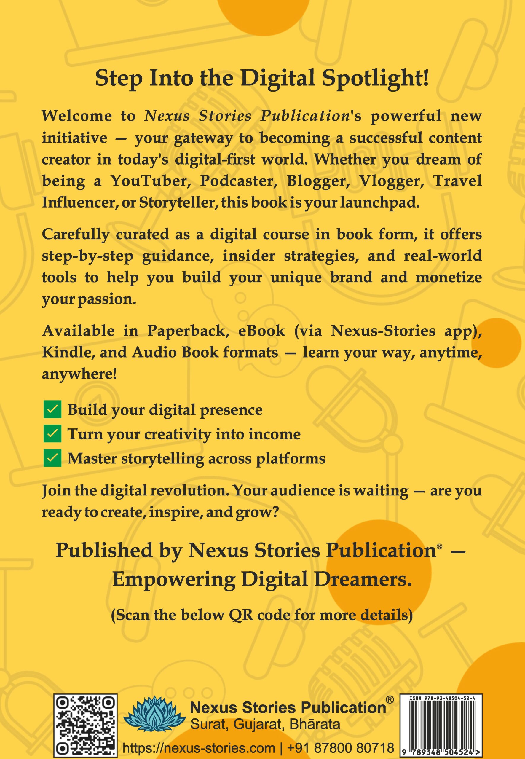 Step Into the Digital Spotlight! Welcome to Nexus Stories Publication’s powerful new initiative — your gateway to becoming a successful content creator in today’s digital-first world. Whether you dream of being a YouTuber, Podcaster, Blogger, Vlogger, Travel Influencer, or Storyteller, this book is your launchpad. Carefully curated as a digital course in book form, it offers step-by-step guidance, insider strategies, and real-world tools to help you build your unique brand and monetize your passion. Available in Paperback, eBook (via Nexus-Stories app), Kindle, and Audio Book formats — learn your way, anytime, anywhere!