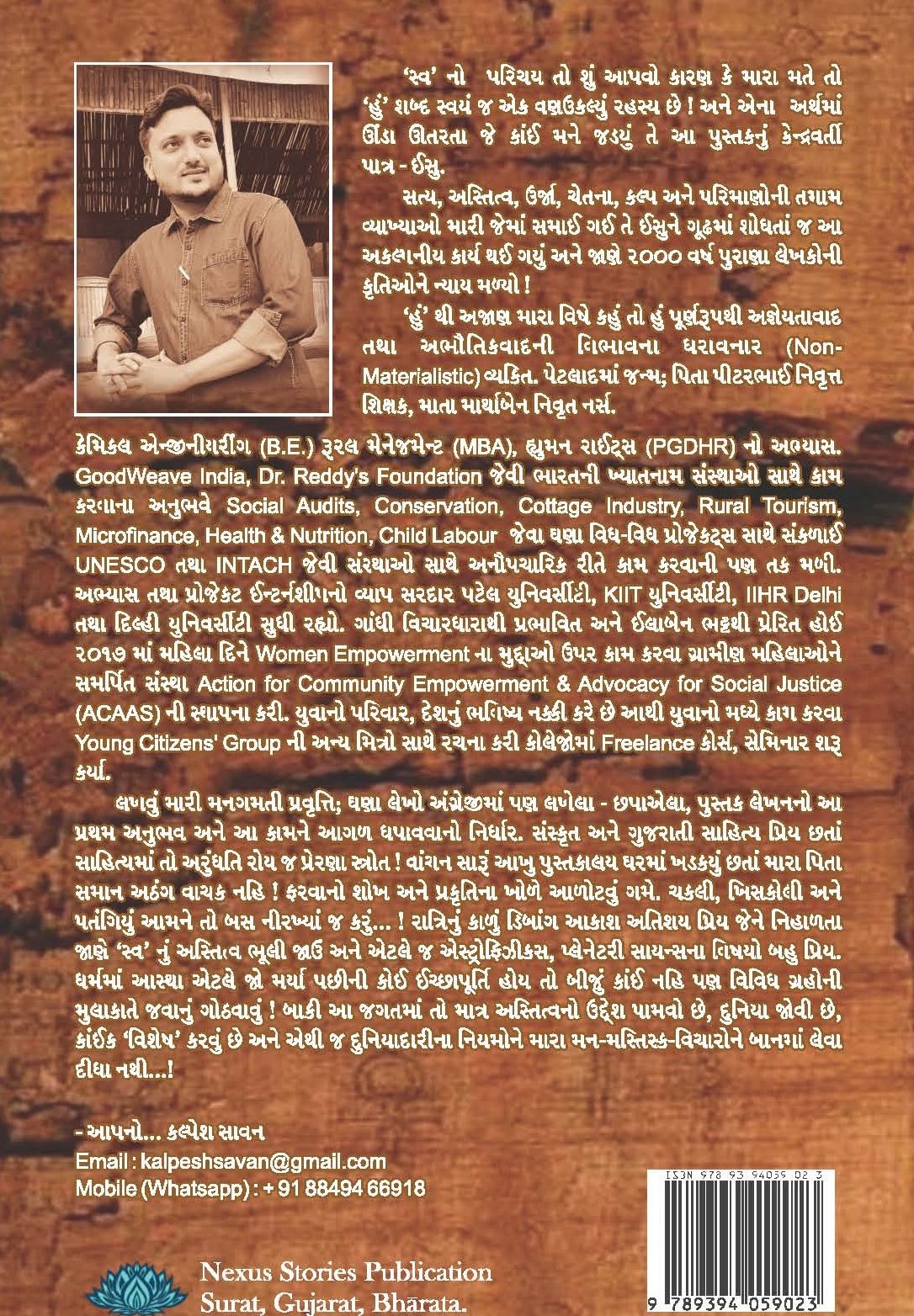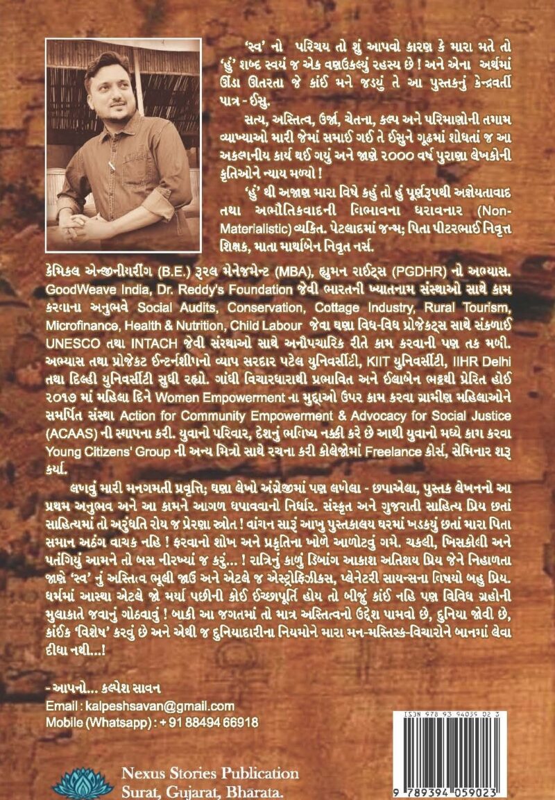 ‘સ્વ’ નો પરિચય તો શું આપવો કારણ કે મારા મતે તો ‘હું’ શબ્દ સ્વયં જ એક વણઉકલ્યું રહસ્ય છે! અને એના અર્થમાં ઊંડા ઊતરતા જે કાઈ મને જડ્યું તે આ પુસ્તકનું કેન્દ્રવર્તી પાત્ર – ઈસુ. સત્ય, અસ્તિત્વ, ઊર્જા, ચેતના, કલ્પ અને પરિમાણોની તમામ વ્યાખ્યાઓ મારી જેમાં સમાઈ ગઈ તે ઈસુને ગૂઢમાં શોધતાં જ આ અકલ્પનીય કાર્ય થઈ ગયું અને જાણે ૨૦૦૦ વર્ષ પુરાણા લેખકોની કૃતિઓને ન્યાય મળ્યો! લખવું મારી મનગમતી પ્રવૃત્તિ; ઘણા લેખો અંગ્રેજીમાં પણ લખેલા-છપાએલા, પુસ્તક લેખનનો આ પ્રથમ અનુભવ અને આ કામને આગળ ધપાવવાનો નિર્ધાર. સંસ્કૃત અને ગુજરાતી સાહિત્ય પ્રિય છતાં સાહિત્યમાં તો અરુંધતિ રોય જ પ્રેરણા સ્ત્રોત! વાંચન સારું આખુ પુસ્તકાલય ઘરમાં ખડક્યું છતાં મારા પિતા સમાન અઠંગ વાચક નહિ! ફરવાનો શોખ અને પ્રકૃતિના ખોળે આળોટવું ગમે. ચકલી, ખિસકોલી અને પતંગિયું આમને તો બસ નીરખ્યાં જ કરું…! રાત્રિનું કાળું ડિબાંગ આકાશ અતિશય પ્રિય જેને નિહાળતા જાણે ‘સ્વ’ નુ અસ્તિત્વ ભૂલી જાઉં અને એટલે જ એસ્ટ્રોફિઝીક્સ, પ્લેનેટરી સાયન્સના વિષયો બહુ પ્રિય. ધર્મમાં આસ્થા એટલે જો મર્યા પછીની કોઈ ઈચ્છાપૂર્તિ હોય તો બીજું કાંઈ નહિ પણ વિવિધ ગ્રહોની મુલાકાતે જવાનું ગોઠવાવું! બાકી આ જગતમાં તો માત્ર અસ્તિત્વનો ઉદેશ્ય પામવો છે, દુનિયા જોવી છે, કાંઈક ‘વિશેષ’ કરવું છે અને એથી જ દુનિયાદારીના નિયમોને મારા મન-મસ્તિસ્ક-વિચારોને બાનમાં લેવા દીધા નથી…!