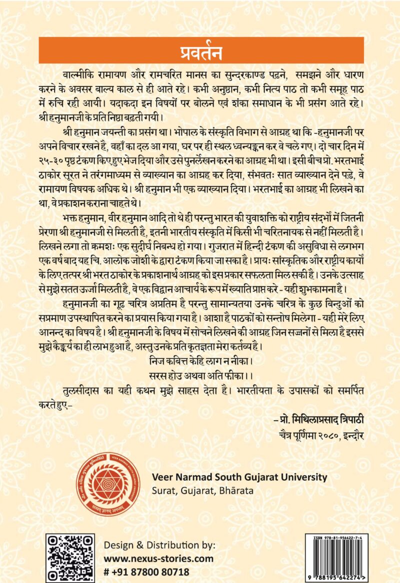 प्रवर्तन वाल्मीकि रामायण और रामचरित मानस का सुन्दरकाण्ड पढ़ने, समझने और धारण करने के अवसर बाल्य काल से ही आते रहे। कभी अनुष्ठान, कभी नित्य पाठ तो कभी समूह पाठ में रुचि रही आयी। यदाकदा इन विषयों पर बोलने एवं शंका समाधान के भी प्रसंग आते रहे। श्री हनुमानजी के प्रति निष्ठा बढ़ती गयी। भक्त हनुमान, वीर हनुमान आदि तो थे ही परन्तु भारत की युवाशक्ति को राष्ट्रीय संदर्भों में जितनी प्रेरणा श्री हनुमानजी से मिलती है, इतनी भारतीय संस्कृति में किसी भी चरितनायक से नहीं मिलती है। लिखने लगा तो क्रमशः एक सुदीर्घ निबन्ध हो गया। गुजरात में हिन्दी टंकण की असुविधा से लगभग एक वर्ष बाद यह चि. आलोक जोशी के द्वारा टंकण किया जा सका है। प्रायः सांस्कृतिक और राष्ट्रीय कार्यों के लिए तत्पर श्री भरत ठाकोर के प्रकाशनार्थ आग्रह को इस प्रकार सफलता मिल सकी है। उनके उत्साह से मुझे सतत ऊर्जा मिलती है, वे एक विद्वान आचार्य के रूप में ख्याति प्राप्त करे – यही शुभकामना है। हनुमानजी का गूढ़ चरित्र अप्रतिम है परन्तु सामान्यतया उनके चरित्र के कुछ बिन्दुओं को सप्रमाण उपस्थापित करने का प्रयास किया गया है। आशा है पाठकों को सन्तोष मिलेगा – यही मेरे लिए आनन्द का विषय है। श्री हनुमानजी के विषय में सोचने लिखने की आग्रह जिन सज्जनों से मिला है इससे मुझे कैङ्कर्य का ही लाभ हुआ है, अस्तु उनके प्रति कृतज्ञता मेरा कर्तव्य है। निज कबित्त केहि लाग न नीका। सरस होउ अथवा अति फीका।। तुलसीदास का यही कथन मुझे साहस देता है। भारतीयता के उपासकों को समर्पित करते हुए – -प्रो. मिथिलाप्रसाद त्रिपाठी चैत्र पूर्णिमा २०८०, इन्दौर